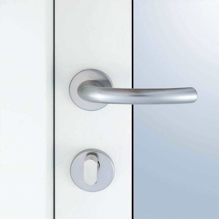 Tokyo facadedørsgreb i mat aluminium inkl. rosetter og 6-stiftet dråbeformet cylinder. Leveres med monteringsvejledning og skruer. (billede set indefra)